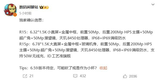 首先是OPPOReno15,本次的标准版将采用一块尺寸为6.32英寸、分辨率为1.5K的小直屏,中框将采用金属材质,整体外观小巧,握持手感应该会非常称手。硬件方面,OPPOReno15的影像配置很给力,前摄为一颗5000万像素的摄像头,后摄则由三颗摄像头组成,分别是一颗2亿像素的HP5主摄镜头、一颗5000W像素的超广角镜头、一颗5000W像素的潜望式长焦镜头。芯片则是搭载天玑8450处理器。