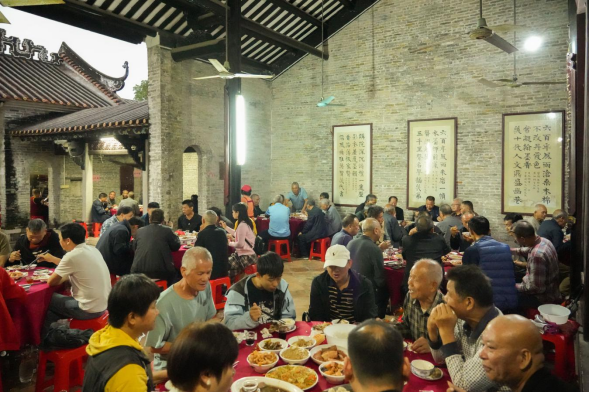 傍晚时分,塱头古村村面一侧的祠堂前,首次对外界开放预定的“塱头投灯宴”率先热闹开席。一桌桌岭南特色宴席座无虚席,炭步本地特色菜品一应俱全,道道都是地道乡味。据悉,投灯宴所得费用将全部用于村内公益性支出,让游客在品尝团圆美味、体验民俗乐趣的同时,也能为古村发展添一份力,让传统节庆与公益善举相融,更添温情。